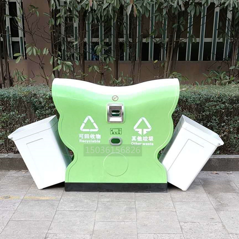 新款模壓耐高溫蝴蝶式垃圾桶果皮箱,由頂蓋、側(cè)板、底座、支架、內(nèi)膽、煙蒂收集盒、廢電池回收盒等附配件組成。